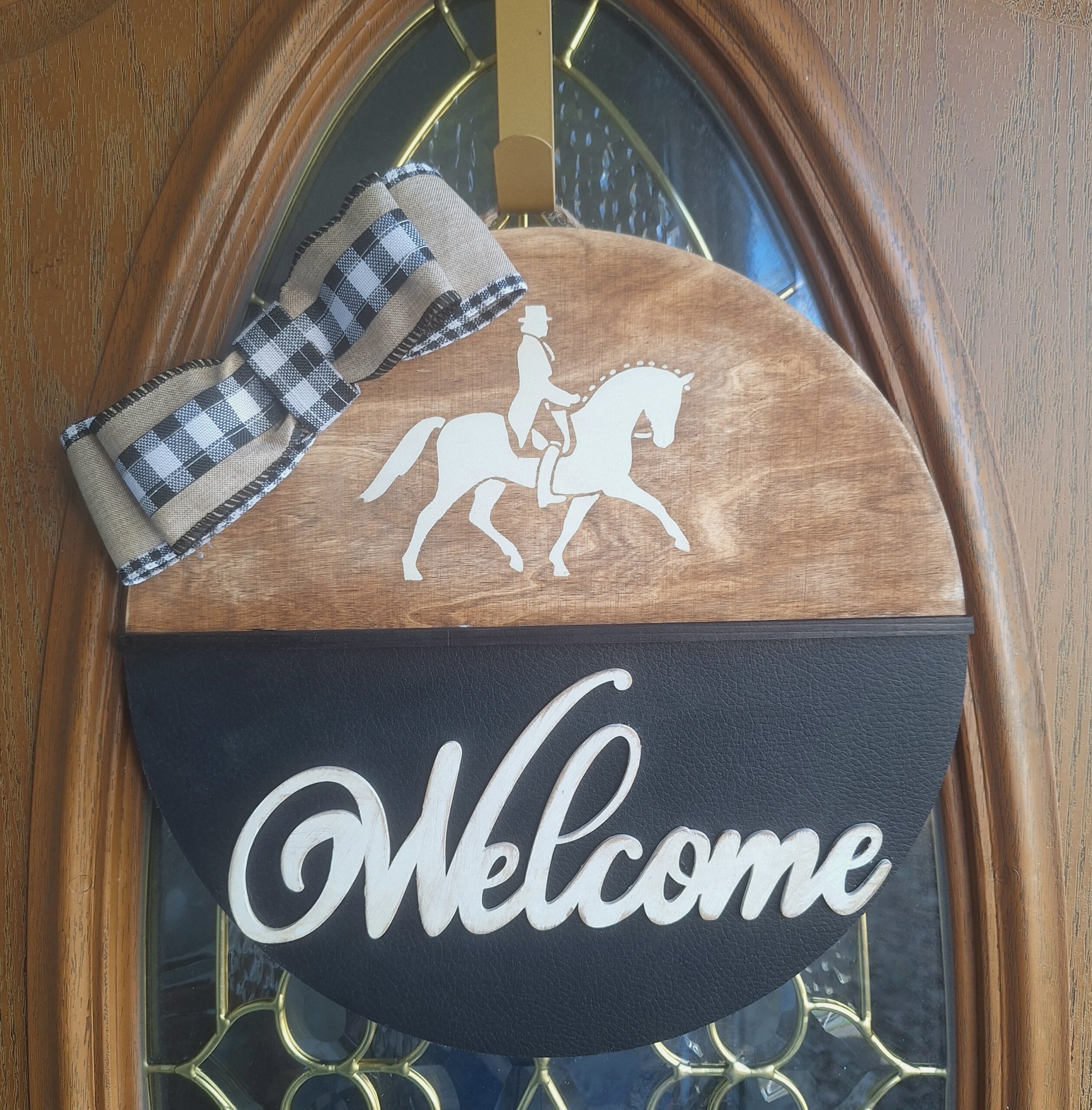 Our Elegant Dressage Welcome Sign is perfect for front doors, barn doors and more. Warm and welcoming, this wooden sign measures 14″ and features a stenciled dressage rider on a stained background. The bottom half is black faux leather with distressed lettering. A black buffalo plaid on burlap bow compliments the piece.